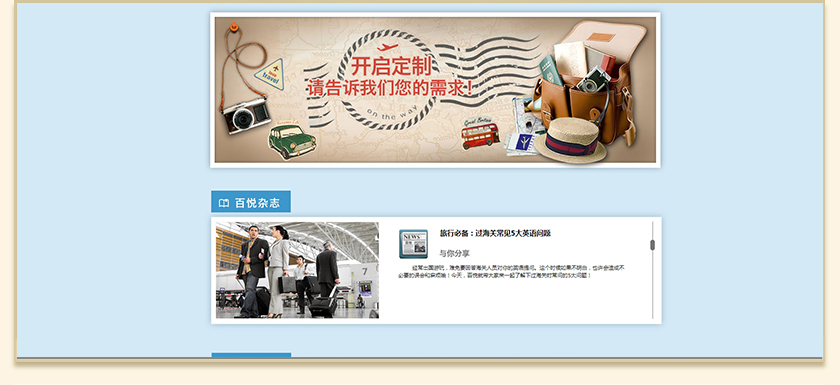 Project Description 百悦逸游于2012年初由二位资深的旅行家创办,是成都传媒集团旗下成都新闻国际旅行社有限公司的高端旅游品牌,总部位于成都高新区天府大道中段美年广场。在百悦逸游成立之前,创始团队亲自到全球三十多个国家实地考察,带着第一手的资讯和执着的信念创立了中国西部第一家真正意义上的私人定制旅行机构。百悦的旅行不是跟团挤大巴,不是十天去十个国家,更不是没完没了的... Official website address 可克达拉http://www.100.travel I want to share